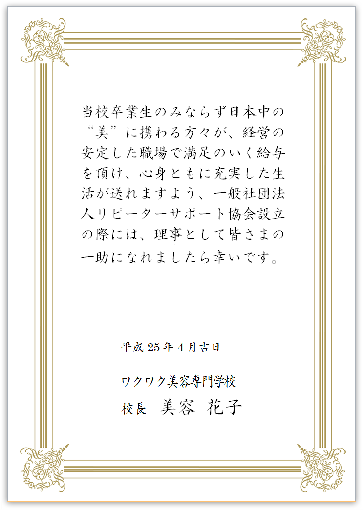 そこで、もし加盟希望者が多くて協会を設立する場合は、ワクワク美容専門学校の美容花子校長が理事としてご就任くださることをお約束いただいております。